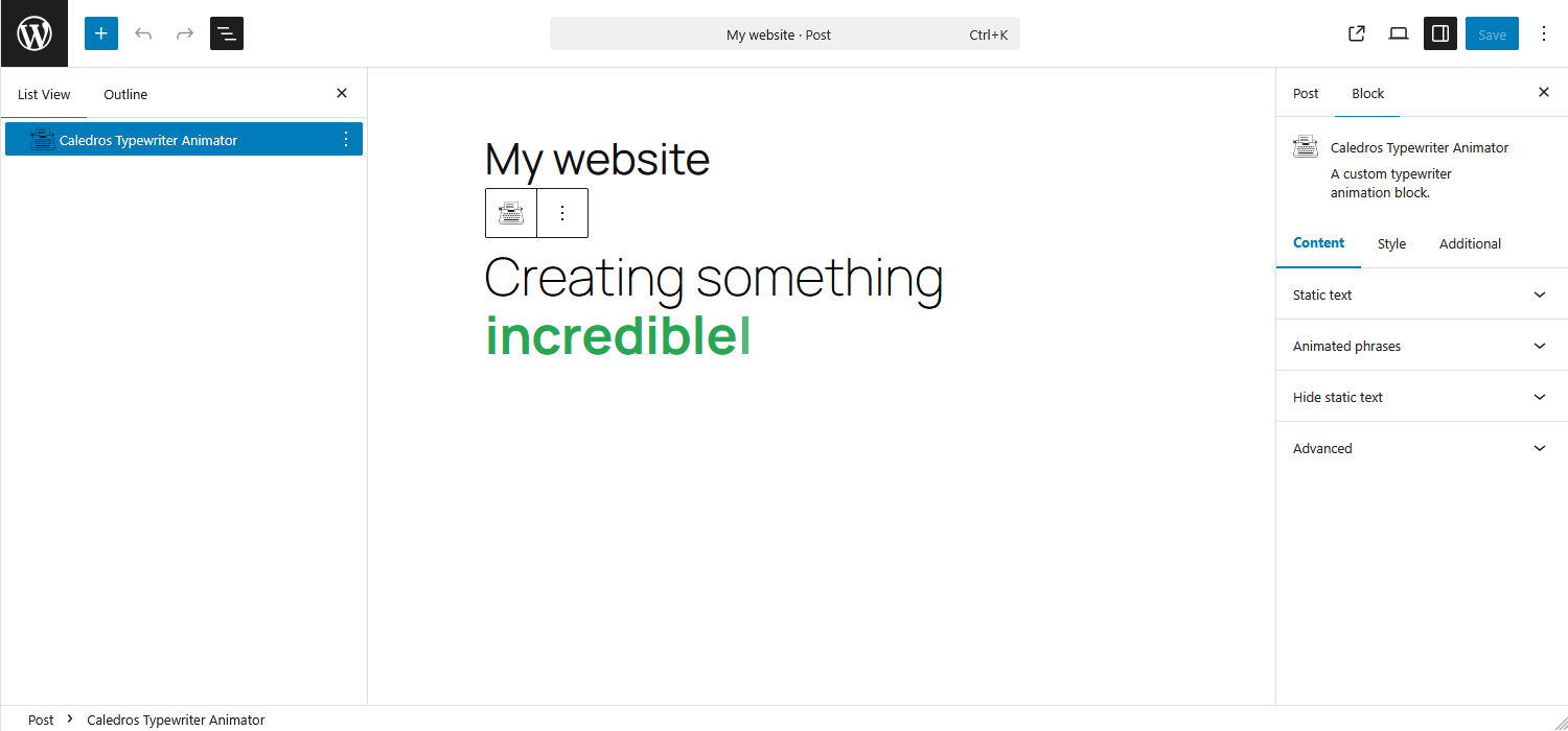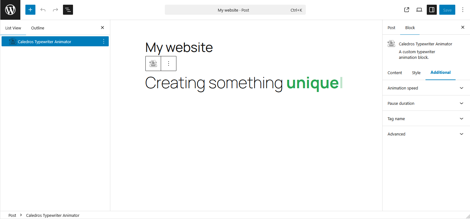 Caledros Typewriter Animator is a WordPress plugin that adds a customizable typewriter-style animated text block to the Gutenberg editor.