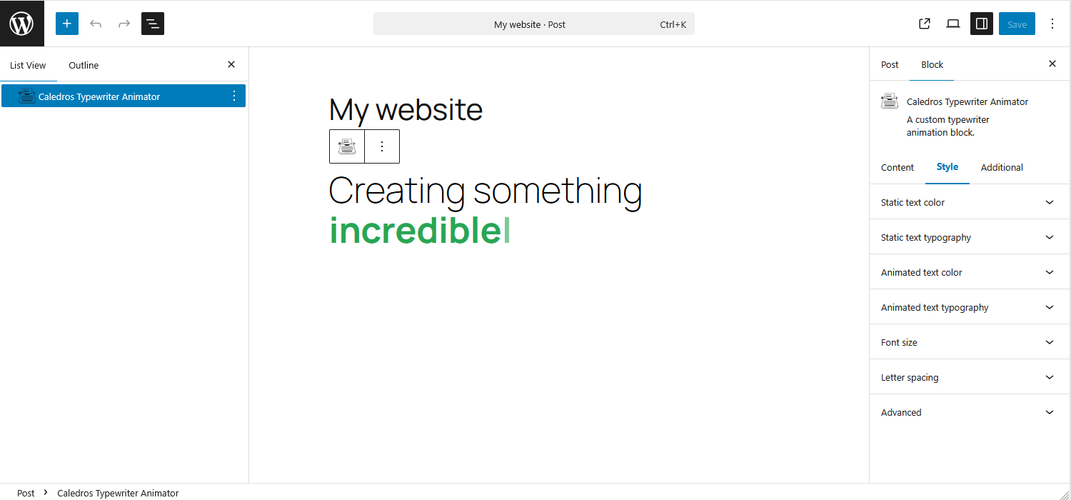 Caledros Typewriter Animator adds a dynamic typewriter-style text animation to the WordPress Gutenberg editor. With this block, you can easily create eye-catching animated text to enhance headings, banners, call-to-actions, or any content where you want to draw attention.