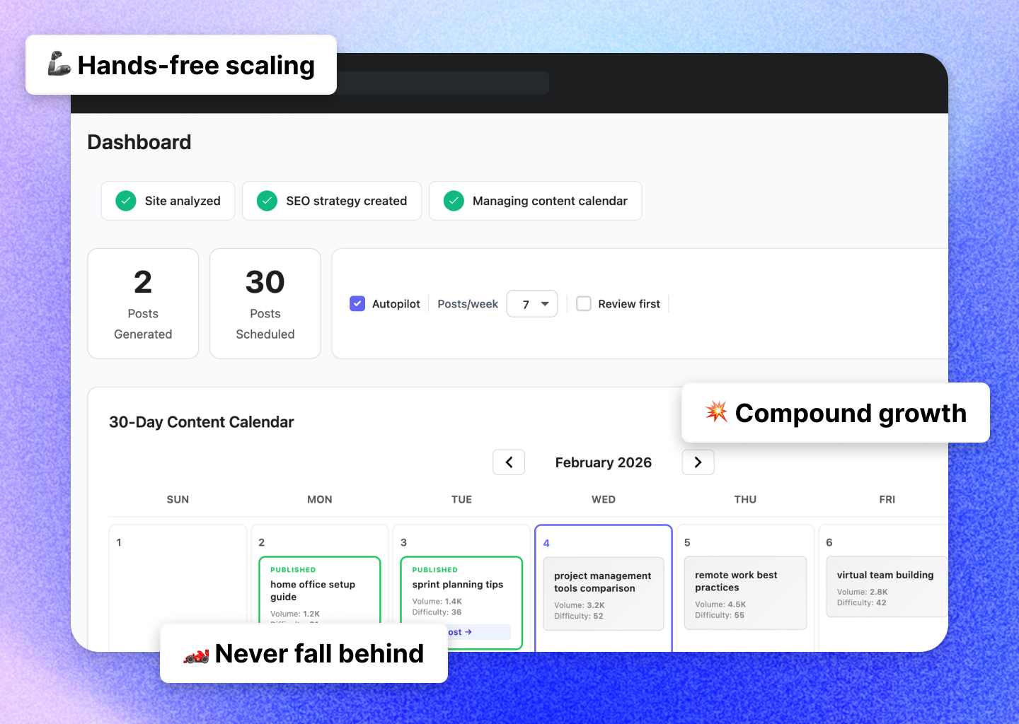 - 30-day SEO Content Calendar: View, edit, and manage your automated content schedule.